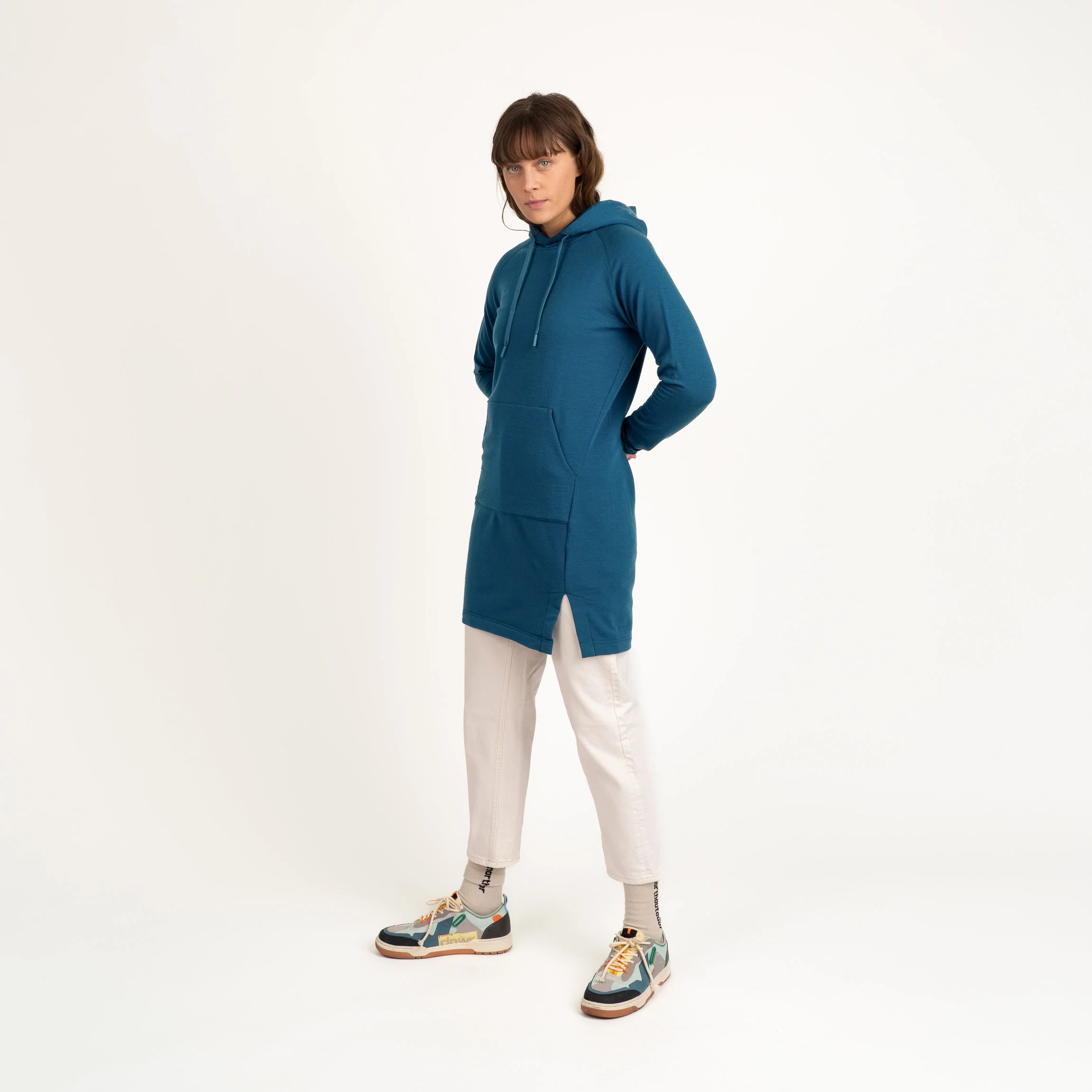 ALL DAY -malliston merinovillafleece hupparimekko on rento ja tyylikäs. Mallissa on etutasku, huppu ja pitkät hihat. Pehmeän merinofleecen ansiosta vaate on mukava ja erityisen lämmin. Neulospainoltaan 250 g/m² tuotteet on tehty 17,5 mikronin merinovillakuidusta.